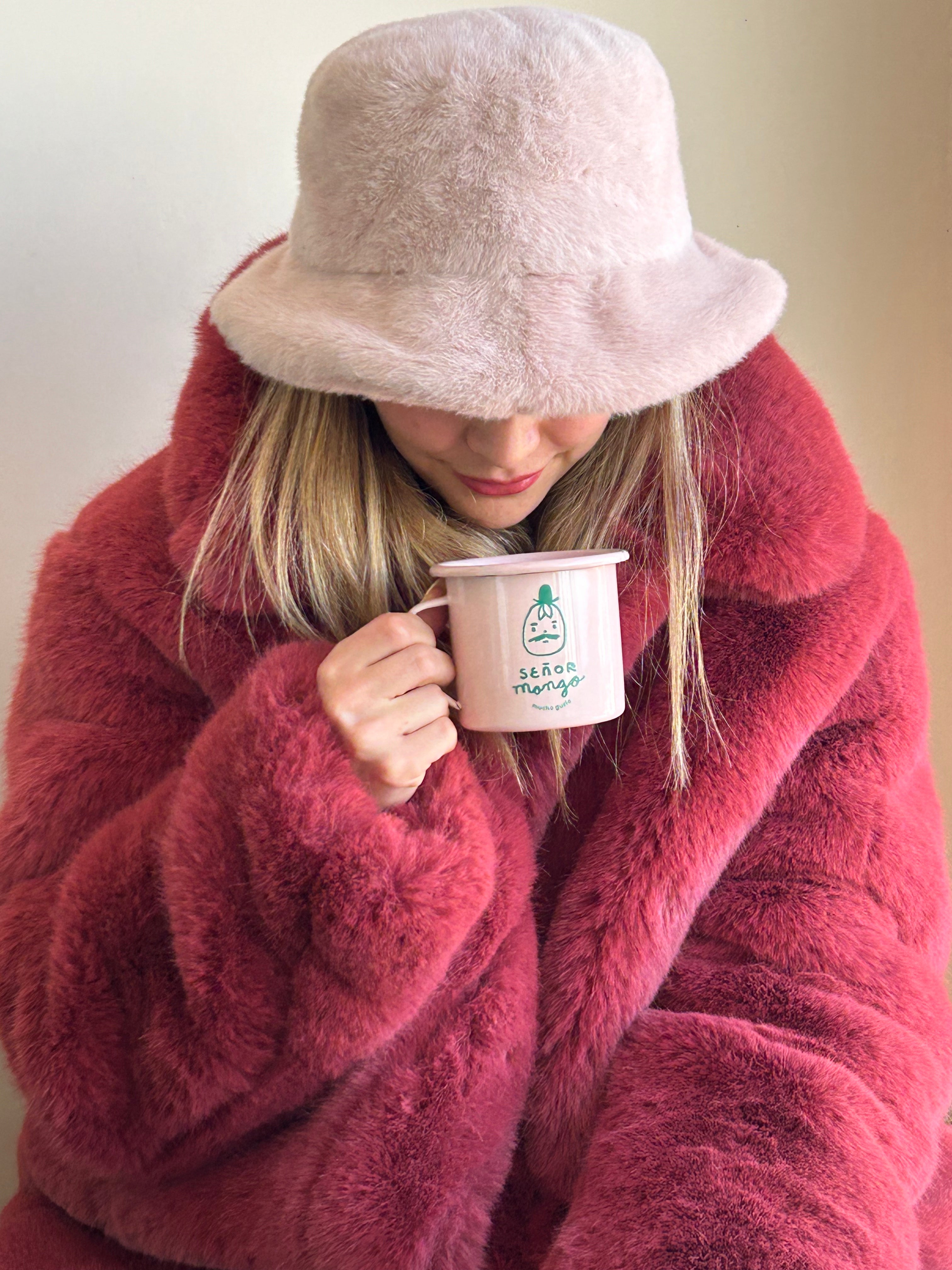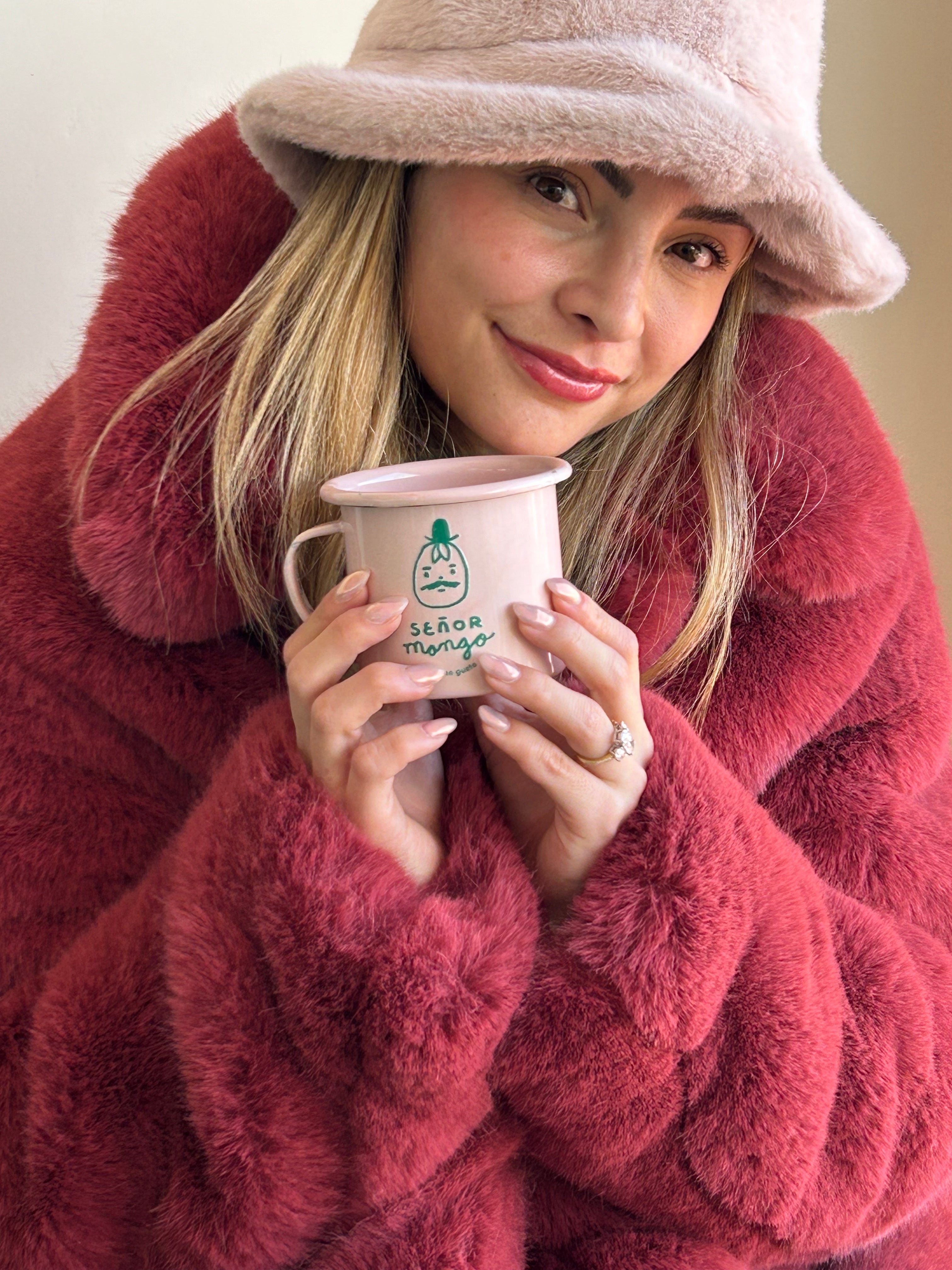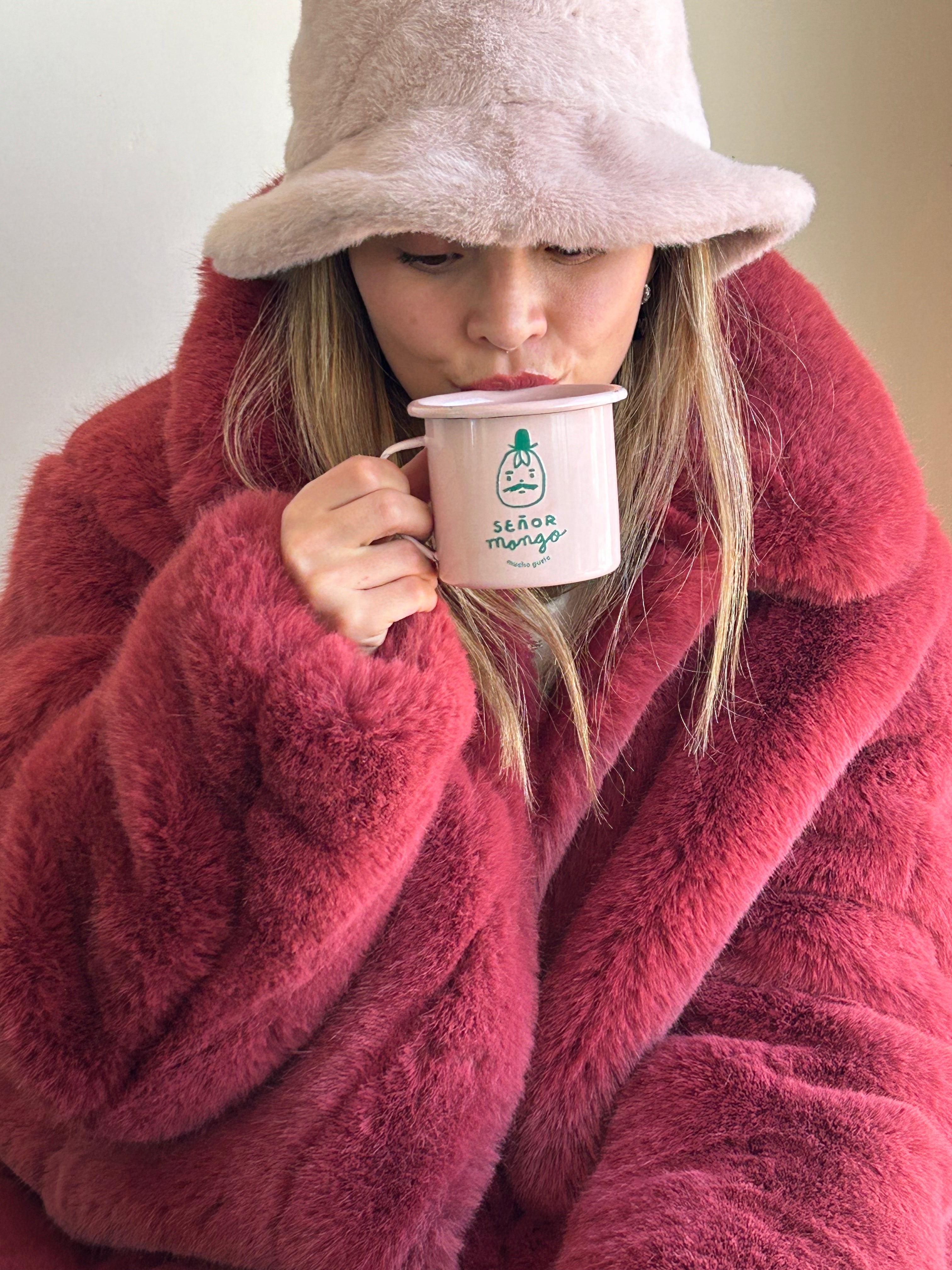 Taza color rosa claro, de peltre con logo Señor Mango, mucho gusto.